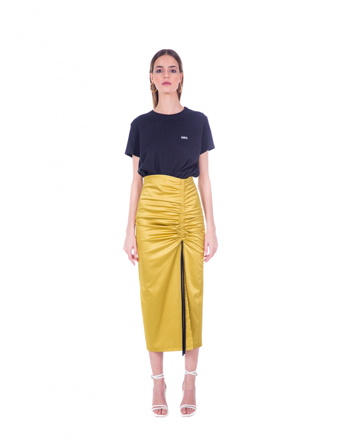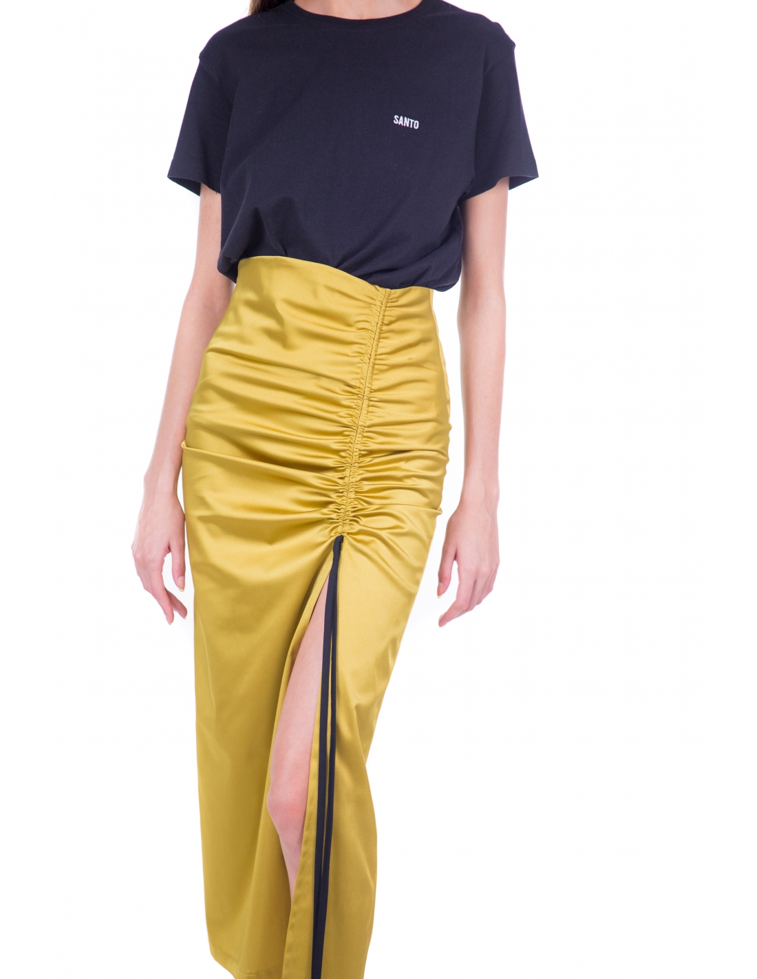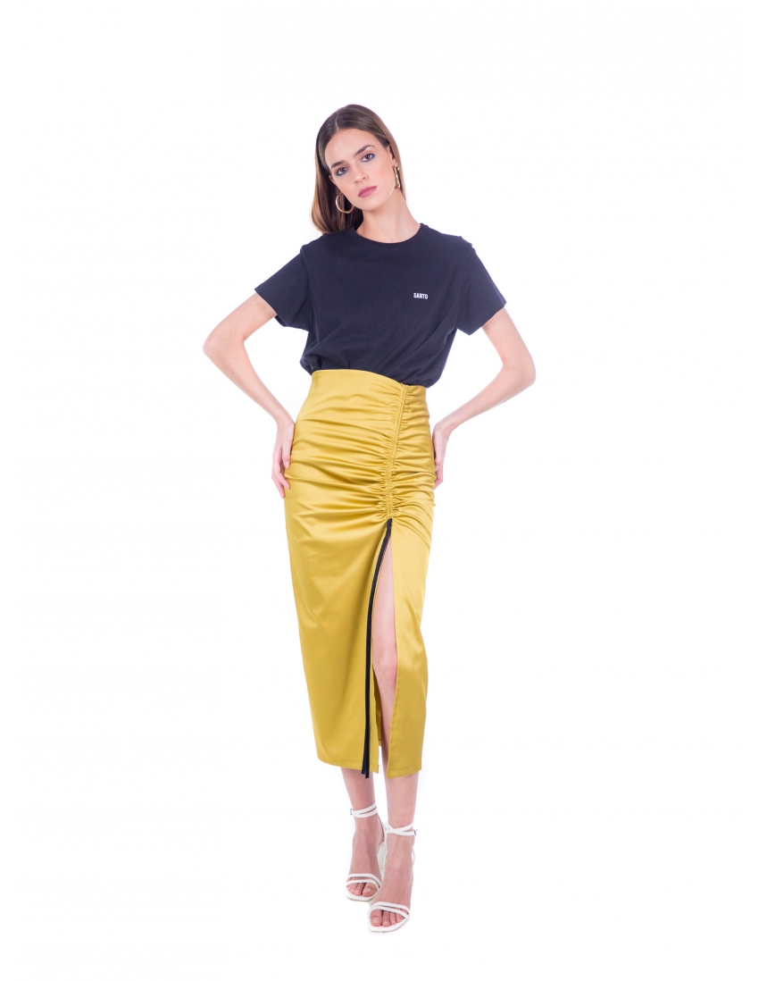 falda midi en satén lima con frunce regulable y abertura lateral. cremallera invisible en el lateral. tejido elástico.