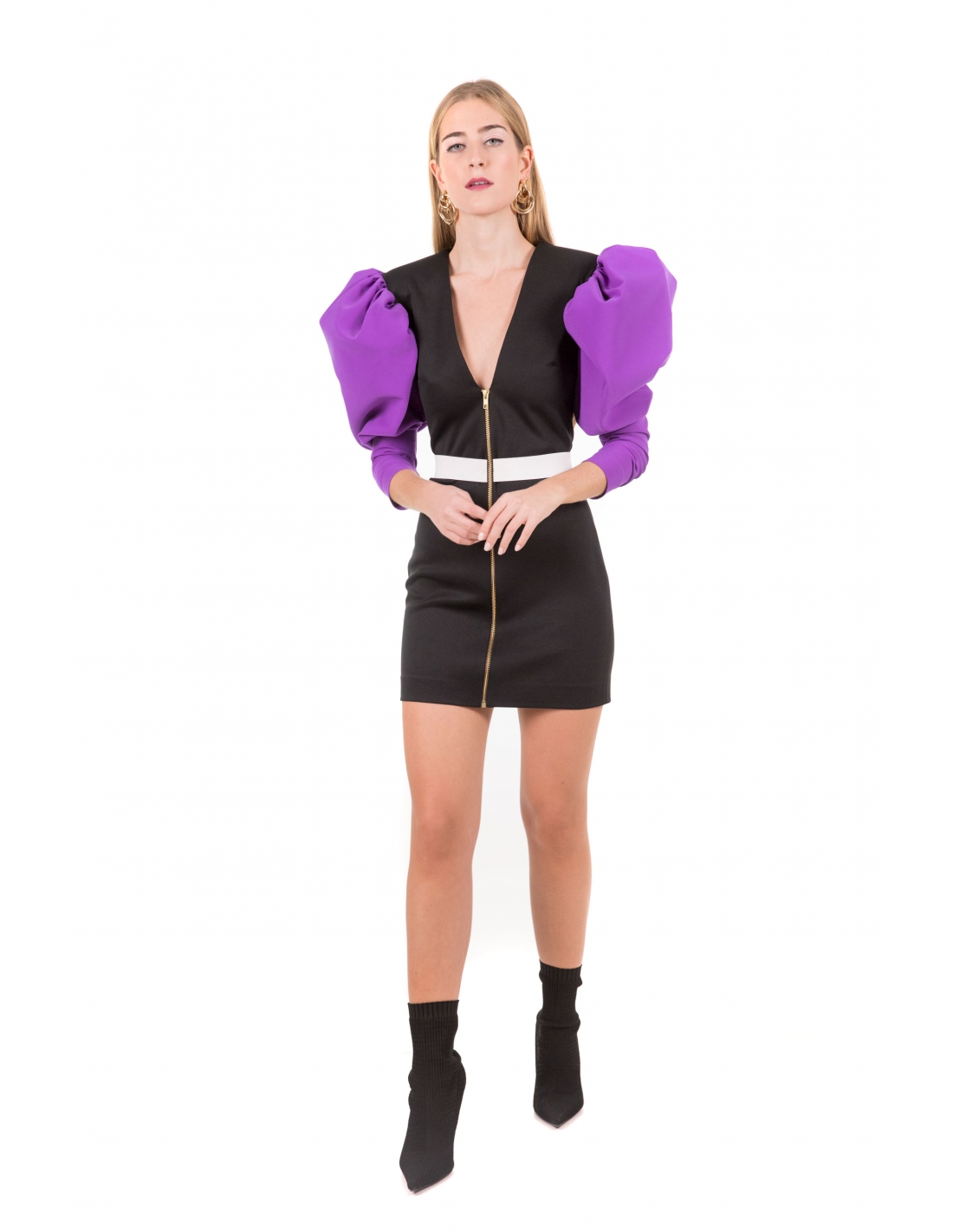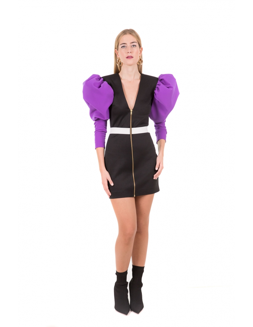 vestido mini en neopreno negro con mangas jamón en tejido lila, cierre delantero con cremallera metálica y elástico blanco en la cintura. Tejido muy elástico.