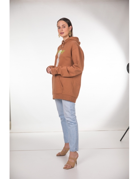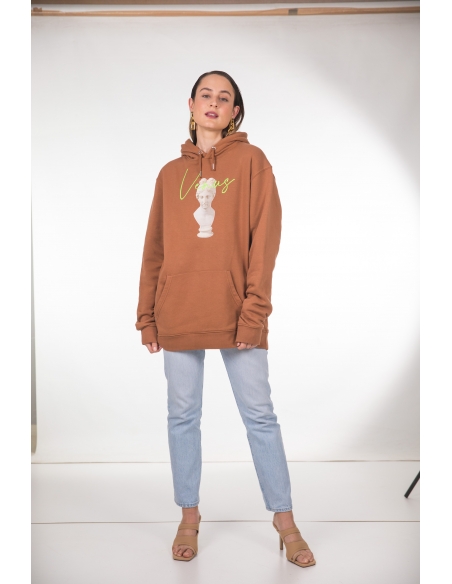 Sudadera color caramelo con bolsillo tipo canguro y gorro ajustable con cordón. Estampado venus y bordado en fluor verde. corte unisex.