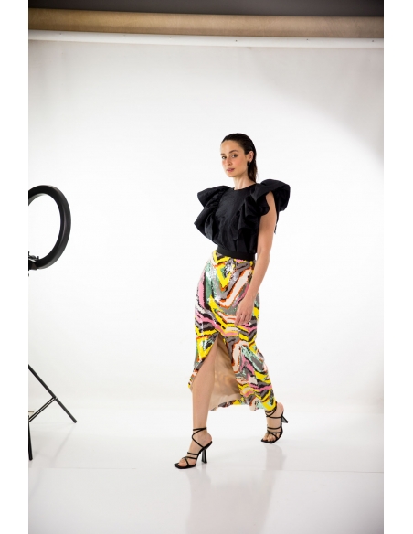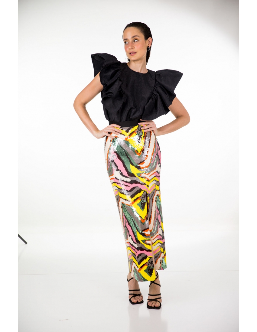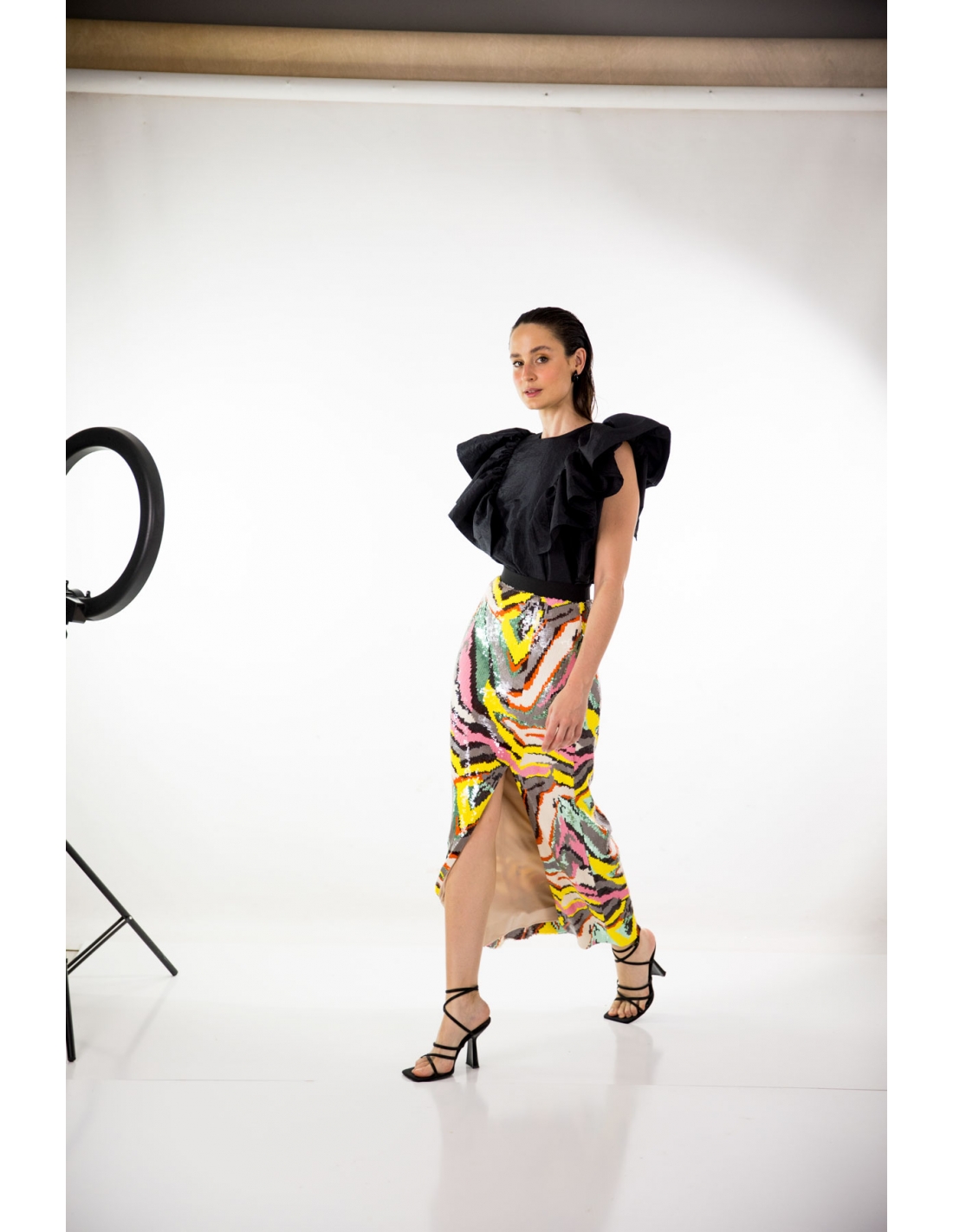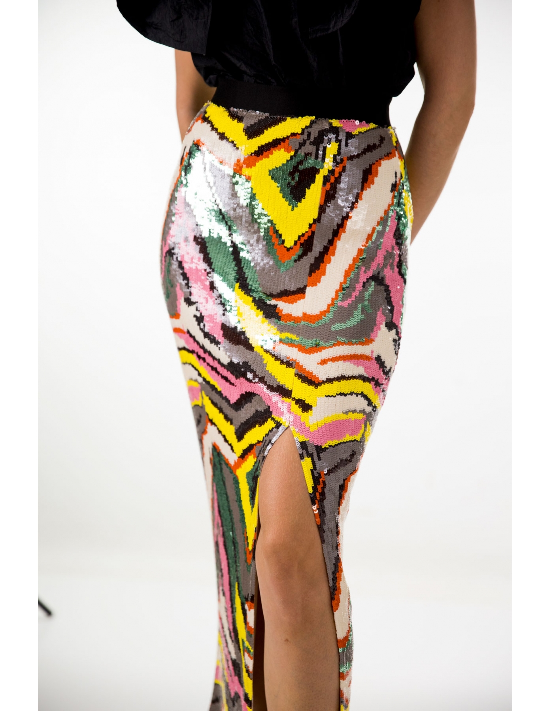 falda midi en tejido lentejuelas multicolor con abertura en el delantero y cinturilla en neopreno negro. cremallera invisible en la espalda. tejido elástico.