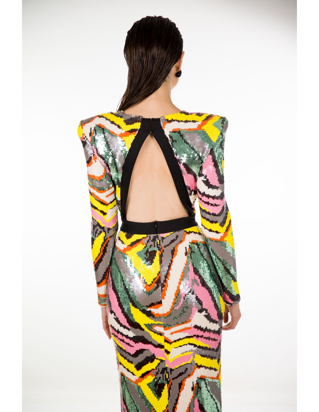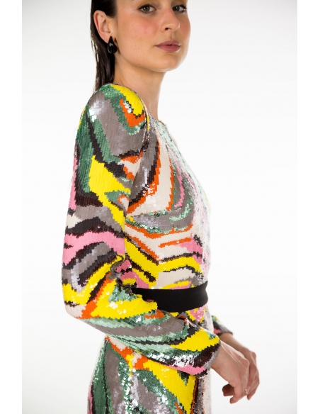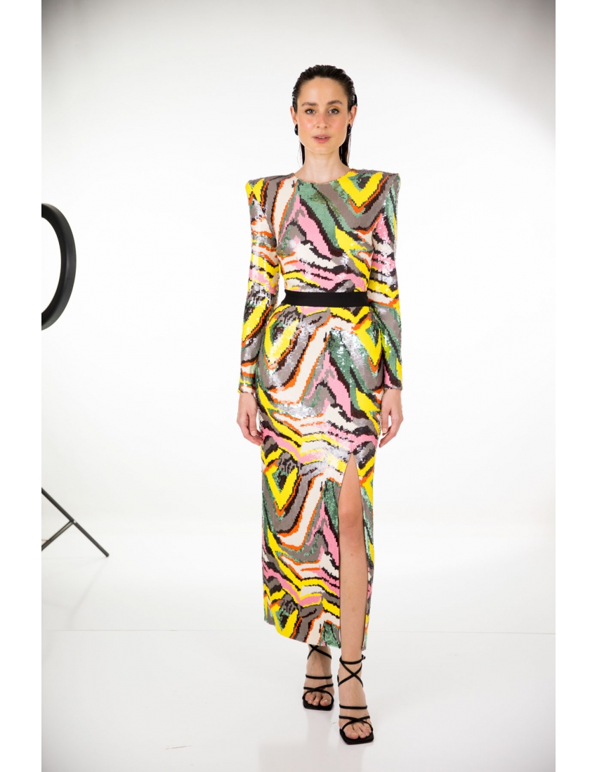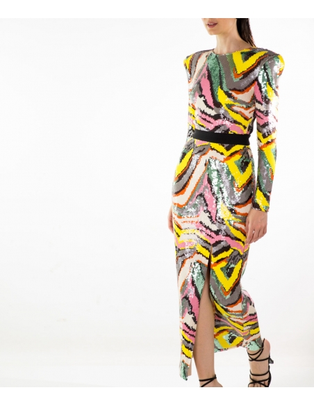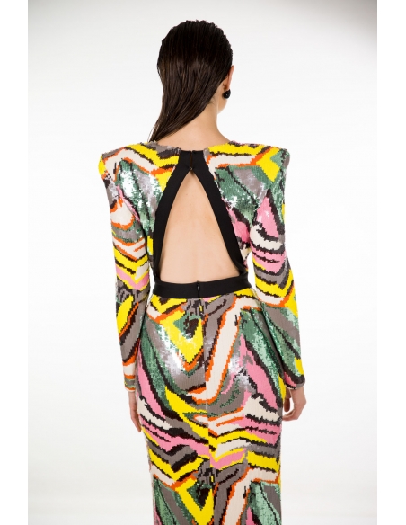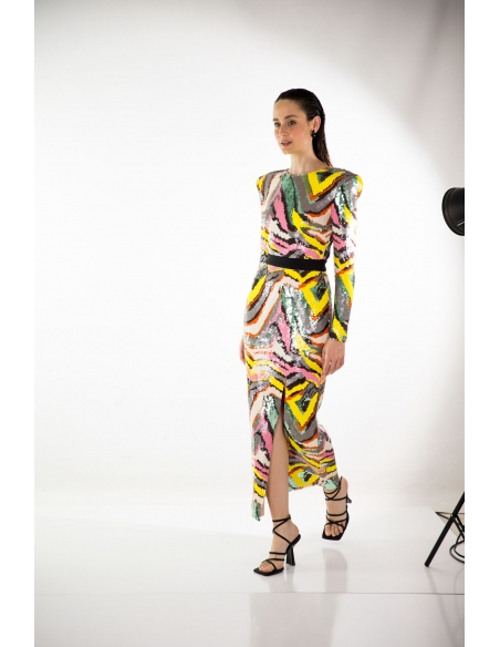 Vestido midi en tejido de lentejuelas multicolor con escote invertido en la espalda, abertura en la falda delantera y maxi hombreras. cremallera invisible en la espalda. tejido bastante elástico.