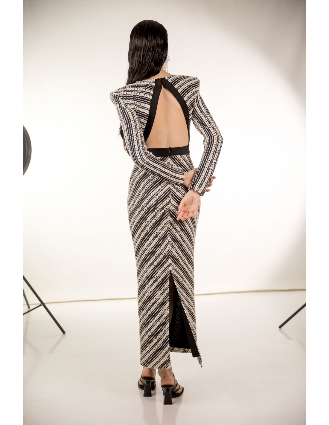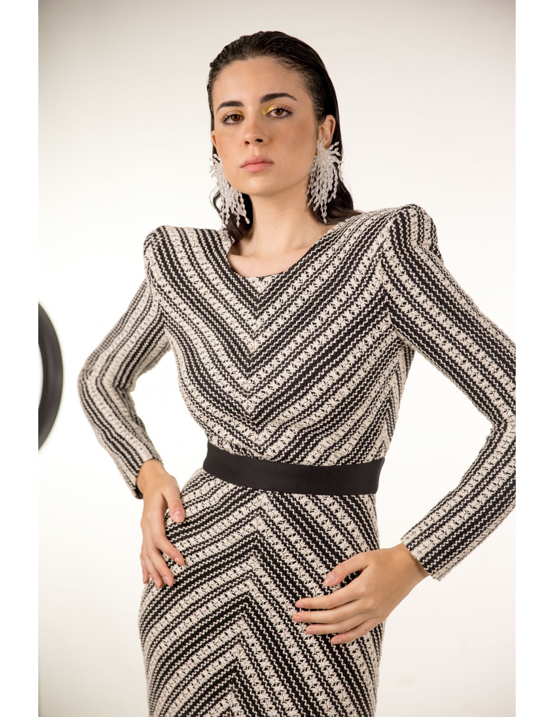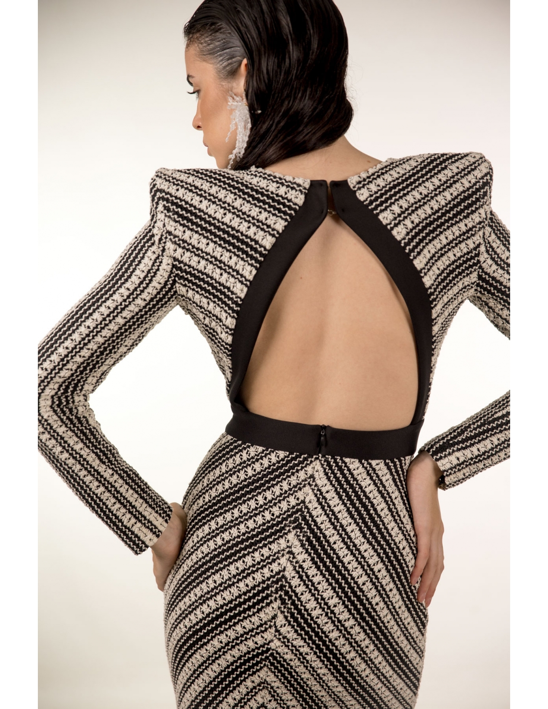 vestido midi en tejido tipo crochet en blanco roto y negro con maxi hombreras. corte en la cintura, espalda al aire y cierre en la espal con cremallera invisible y corchetes.. tejido elástico.
