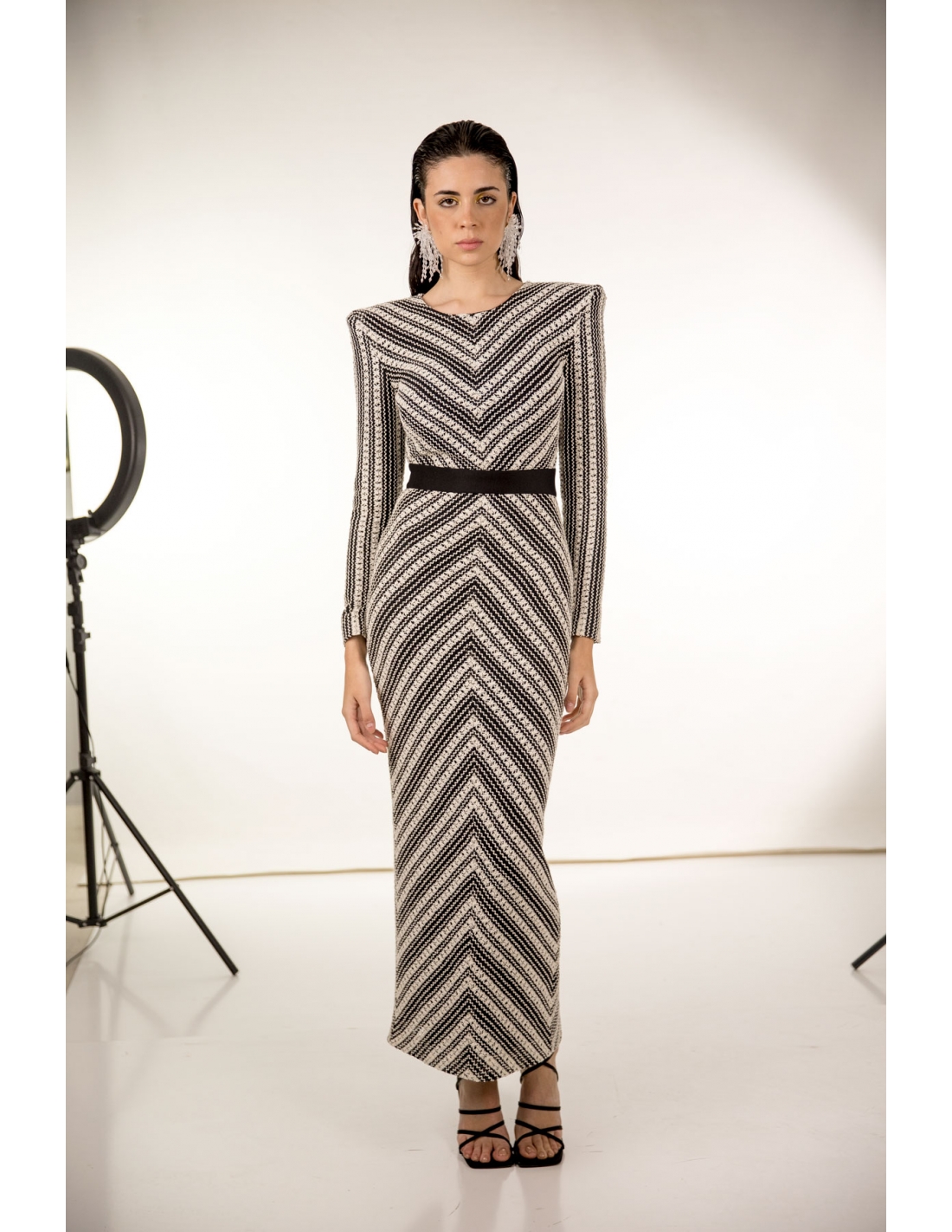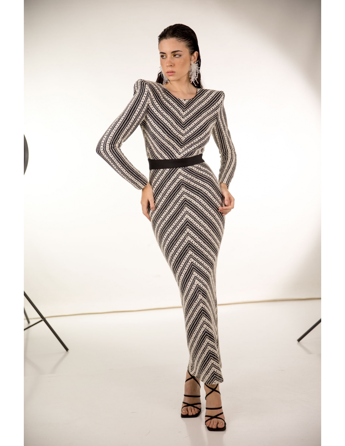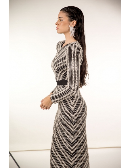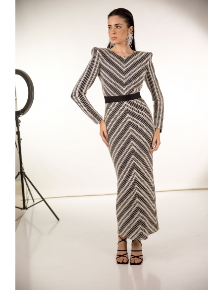 vestido midi en tejido tipo crochet en blanco roto y negro con maxi hombreras. corte en la cintura, espalda al aire y cierre en la espal con cremallera invisible y corchetes.. tejido elástico.