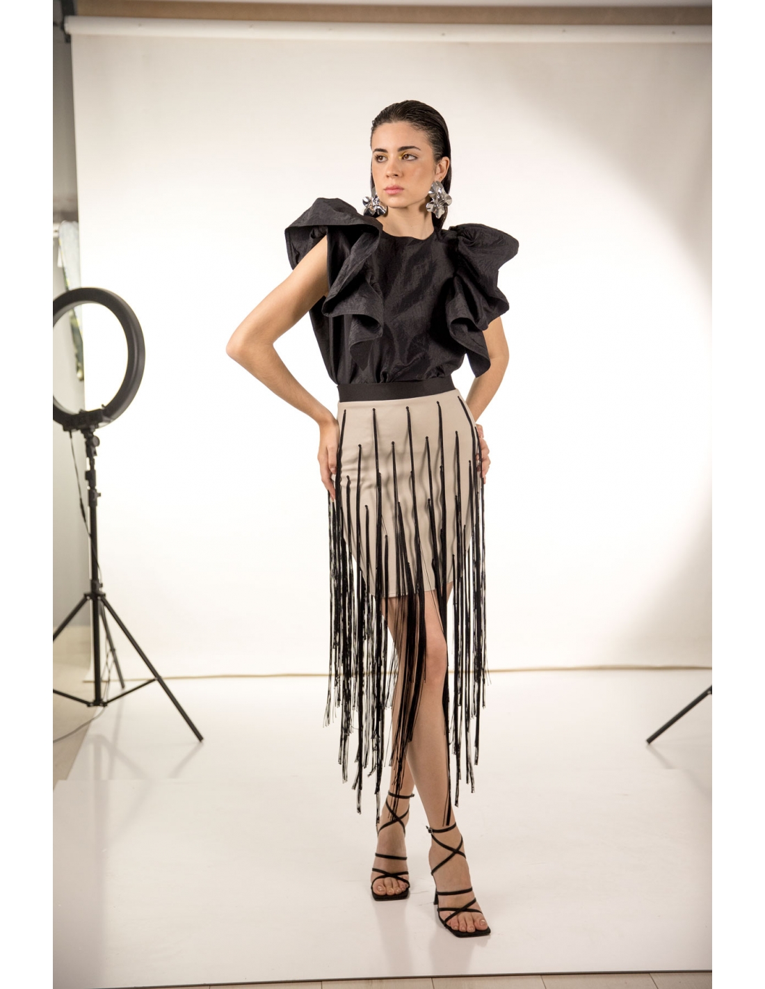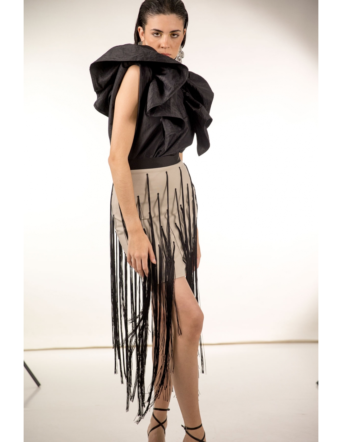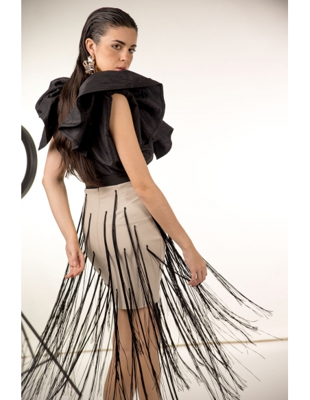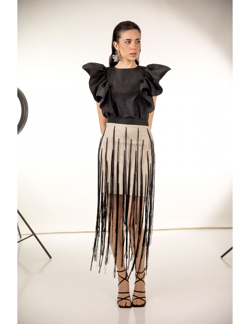 falda mini en neopreno con flecos largos, cierre en la espalda con cremallera invisible. tejido elástico.