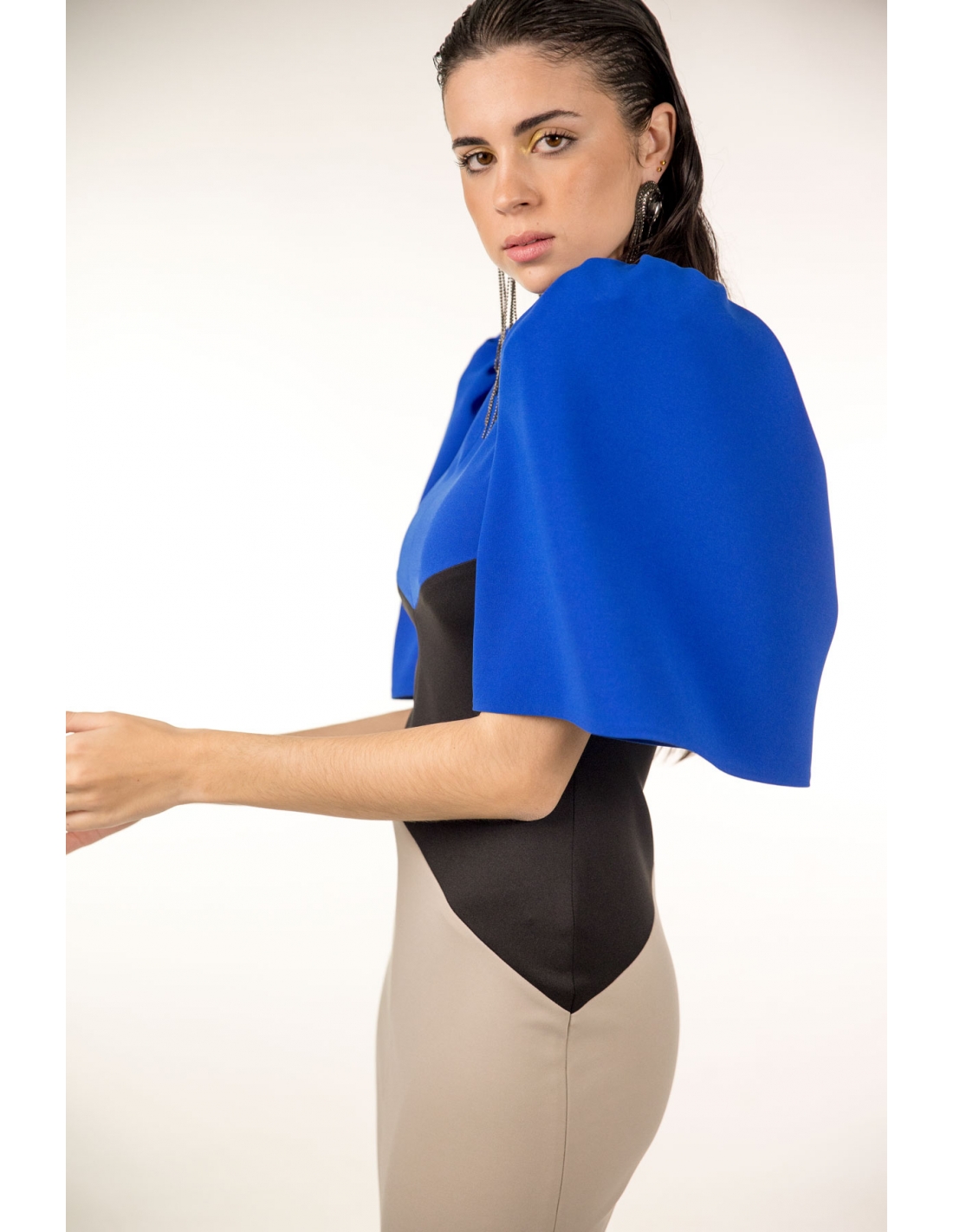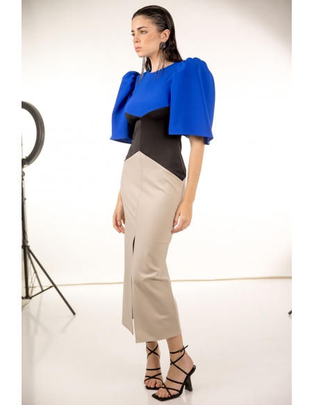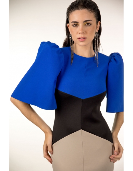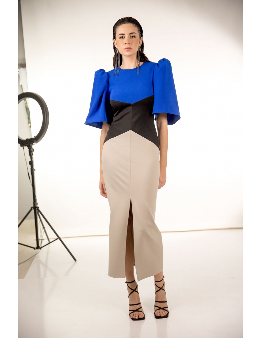 vestido midi tricolor con corte geométrico y manga corta abullonada, cierre en la espalda con cremallera invisible. tejido elástico.