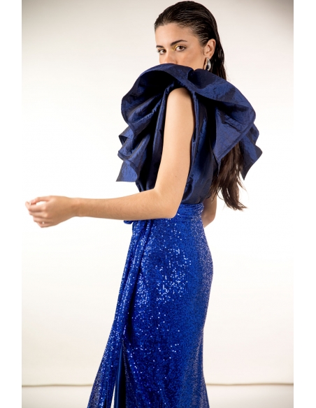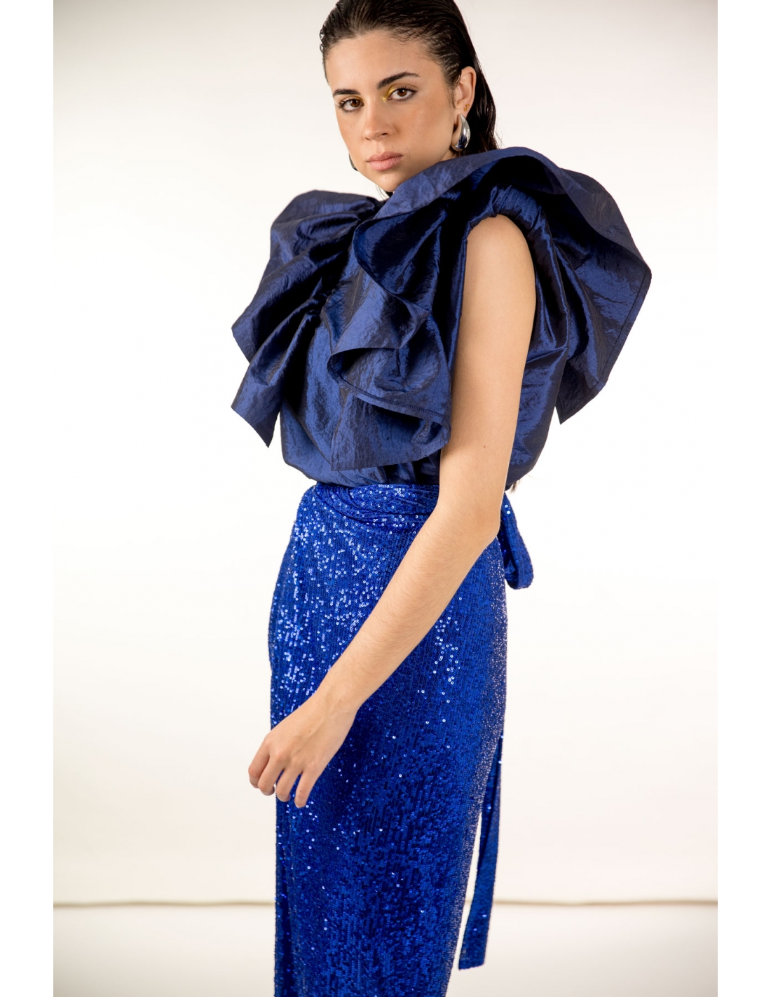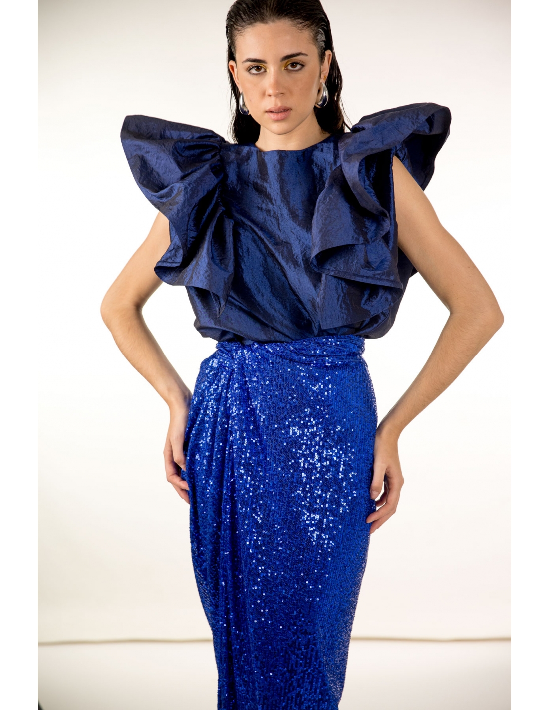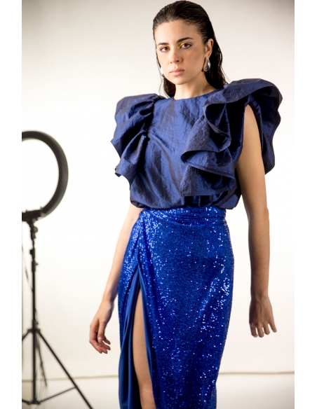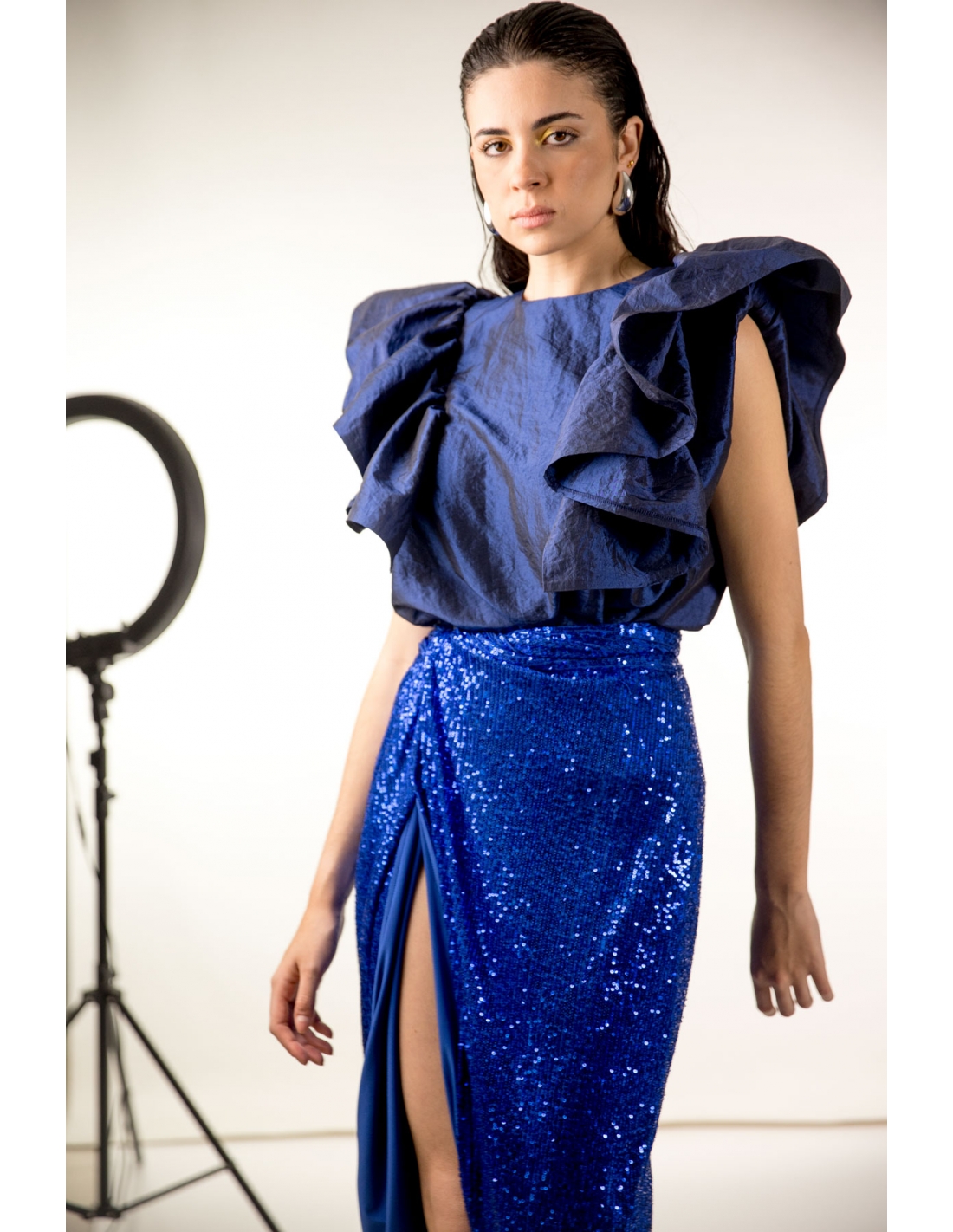 top tafetán azul con maxi hombreras y volumen con volantes. cierre en la espalda con corchete.