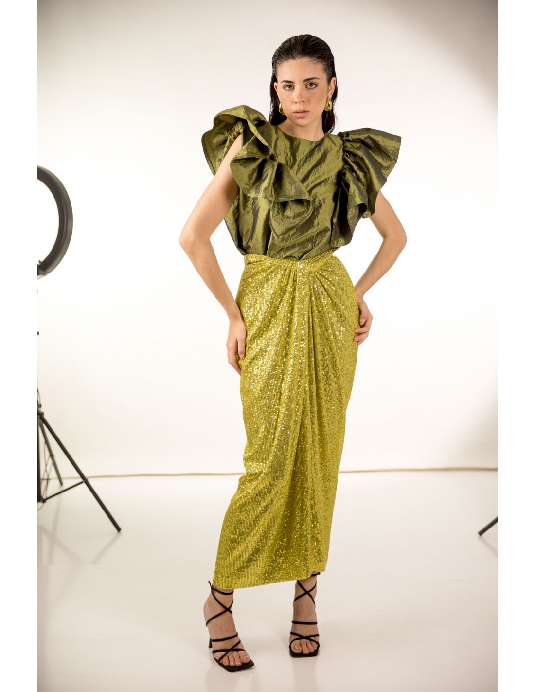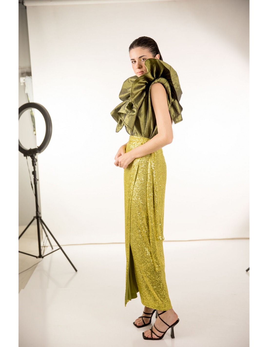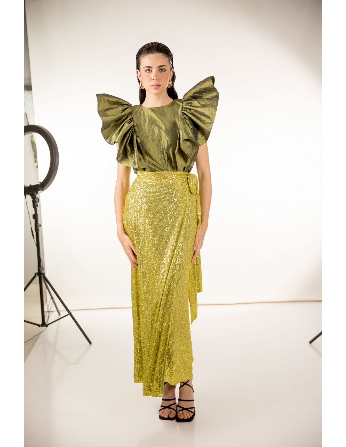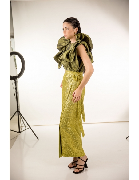 falda midi lentejuelas oliva con diseño tipo pareo, la falda tiene varias opciones de posición, LAZO EN EL LATERAL O NUEDO EN EL CENTRO DELANTERO. cierre con lazo. tejido bastante elástico.