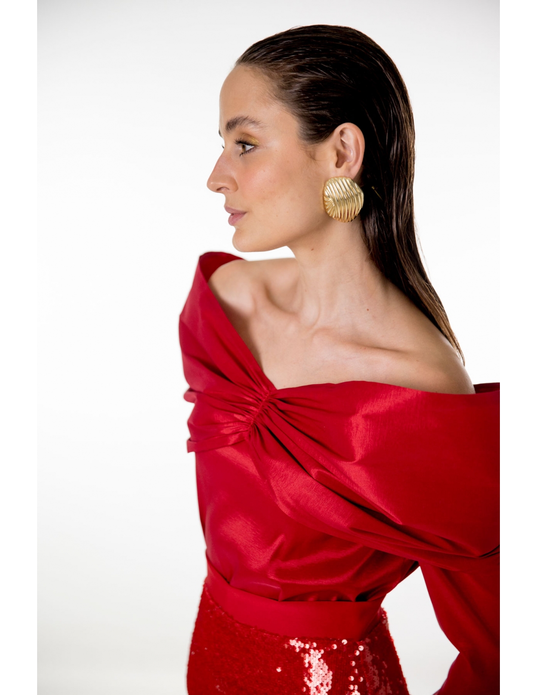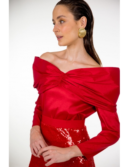 top en tafetán rojo con escote barco y volumen fruncido. tejido elástico.