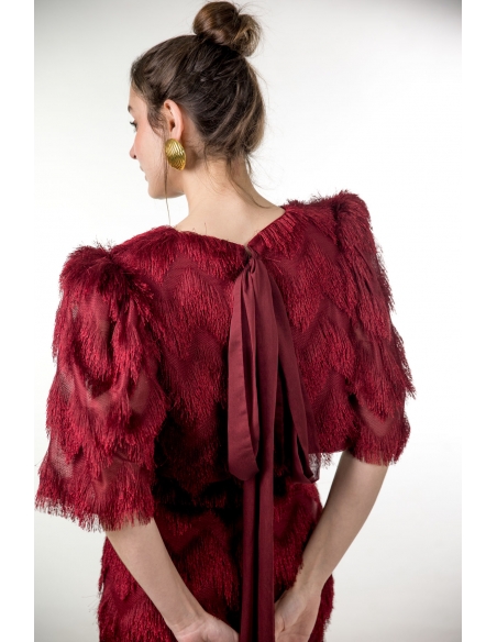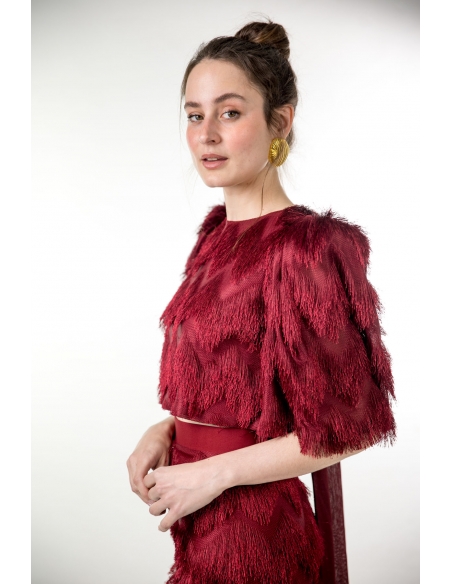 crop tio en tejido de flecos burdeos con manga abullonada corta, lazada maxi en la espalda. cierre con corchete en la espalda. tejido elástico.
