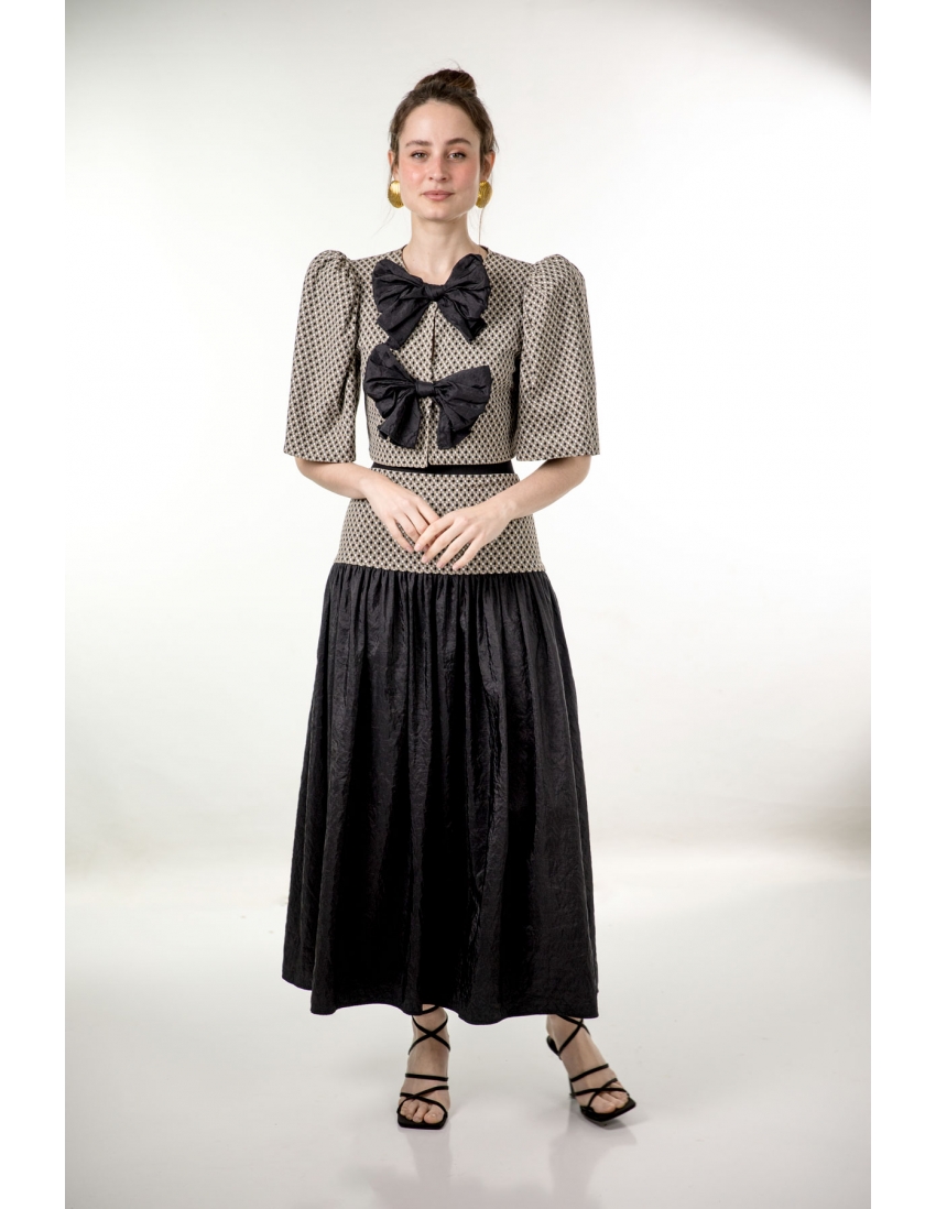 falda midi en tejido de cuadros con volante fruncido en tafetán negro que sale de la cadera. cierre con cremallera invisible en la espalda. tejido elástico.